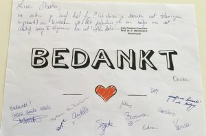 Ze kreeg deze week een hele pakket terug : een bedankingsbrief ondertekend door artsen en verplegers, tekeningen gemaakt door ziekenhuiskindjes, een boekje met leuke opdrachten, ….
