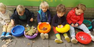 We hoeven maar onze klas uit te stappen en wat in ons schooldomein rond te stappen en de nieuwsgierige oogjes vinden we meer dan we verwachten. De ikkertjes zochten en sorteerden tot ze een heuse winkel hadden. De eikels, de blaadjes, de veertjes, de takjes, de kastanjes, … het kreeg allemaal een naam om zo een stukje van de wereld beter te leren kennen.