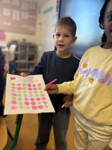 Ze kunnen het ondertussen al zo goed dat ze in duo’s een ganse leesbingo aankunnen. De ene leest luidop, de andere leest muizenstil en controleert of het woordje klopt. Tot alle woorden de revue gepasseerd zijn en we kunnen op zoek gaan wie er 5 op een rij heeft. Het combineren van taal en rekenen dat is dubbel heerlijk …