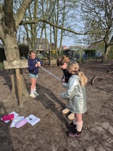 Je trekt naar buiten met het juiste materiaal en een doordachte opdracht. Je giet er wat groeps- en denkwerk bovenop en onze hersenen gaan nieuwsgierig open. Afpassen met touw, afmeten op de rolmeter, omzetten naar de juiste maateenheid, inschatten wat dit betekent en op het einde alle boomomtrekken rangschikken met hun soortnaam erbij.