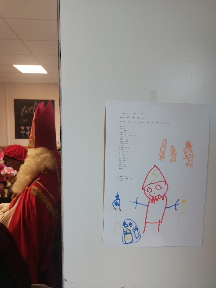 Op de grote typmachine werden met veel aandacht alle namen van de grote Neuzen – onze 3e kleuters – letter voor letter met veel aandacht gezocht, vergeleken en getypt tot het hele lijstje vol was. Zo wist Sinterklaas heel goed wie hij terecht gekomen was. Aan de oproep ‘Kom ook eens bij ons’ kon de Sint uiteraard niet weerstaan.