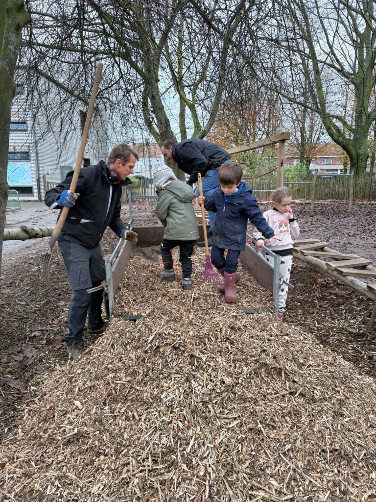 Telkens helpt er één leefgroep met mama’s, papa’s, kinderen en leerkrachten met vele handen samen mee. Wie extra talent of kracht heeft, neemt iedereen op sleeptouw. Hier zie de Neuzen leefgroep aan het werk. Net terug van bij de ploeg bij de grote hakselaar die onze snoeitakken tot snippers vermaalde en bezig met alles op de juiste plaatsen weer uit te strooien.