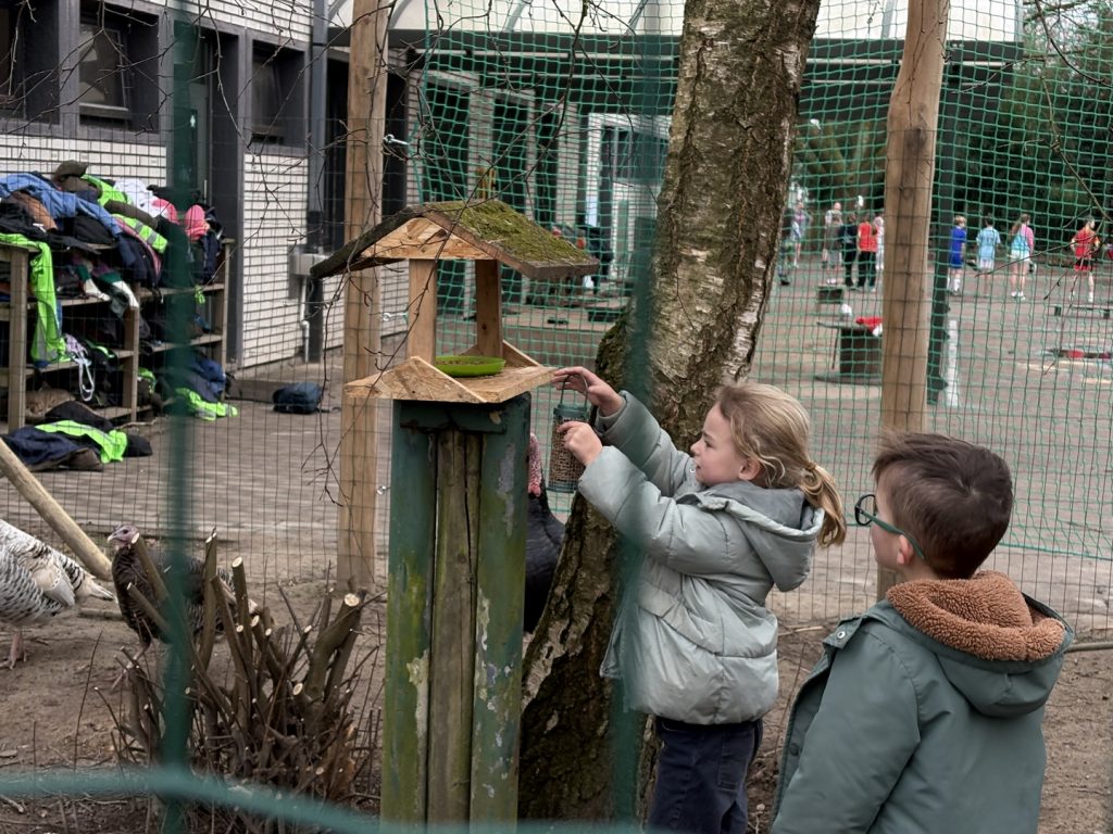 Dagelijks zorgen we voor onze dieren. In kleine vaste gemengde groepjes, zodat we elkaar kunnen aanleren wat nodig is en hoe we met de dieren moeten omgaan. Onze hamsters, varkens, geiten, ganzen, eenden, kippen en kalkoenen zijn jullie zeer dankbaar. Voor de vogels die zomaar voorbijfladderen en even halt houden aan ons domein, timmerden we een nieuw voederplankje en ook dit wordt rijkelijk bediend in de koude wintermaanden.