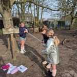 Je trekt naar buiten met het juiste materiaal en een doordachte opdracht. Je giet er wat groeps- en denkwerk bovenop en onze hersenen gaan nieuwsgierig open. Afpassen met touw, afmeten op de rolmeter, omzetten naar de juiste maateenheid, inschatten wat dit betekent en op het einde alle boomomtrekken rangschikken met hun soortnaam erbij.